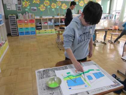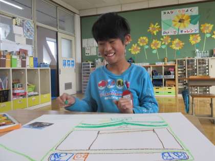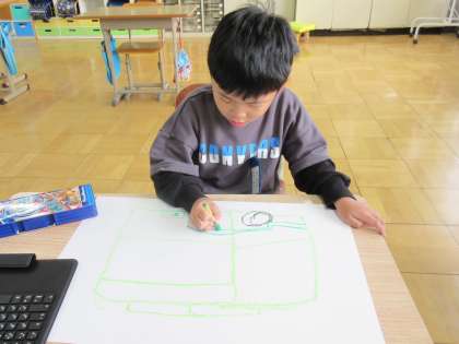 昨日の市バス体験の楽しかった記憶が鮮明なうちに、市バスの絵を描き始めました。