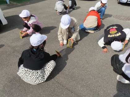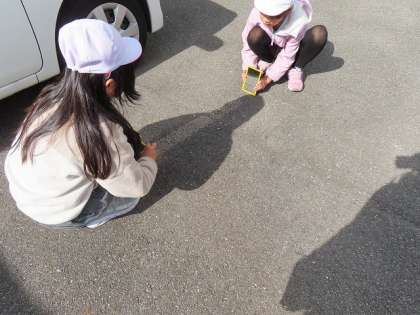 日光を鏡に反射させると光は、どのように進むのかを確かめています。予想では、カーブする?ジグザグ?などいろいろな意見が出ました。実際は、まっすぐに伸びることをみんなで確認しました。