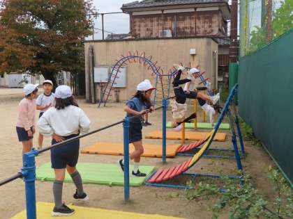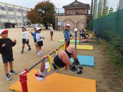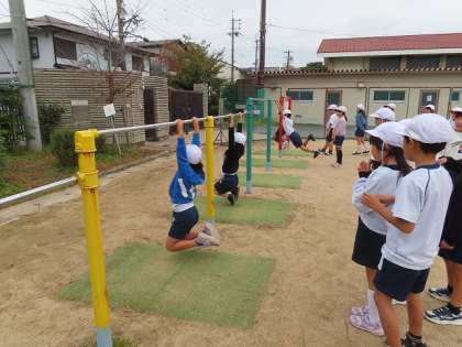鉄棒の学習をがんばっています。体を慣らすためにぶら下がったり、鉄棒をもってジャンプをしたりする準備運動も真剣に取り組んでいます。