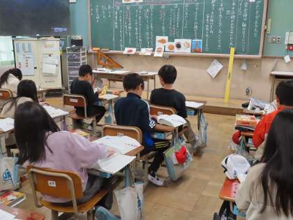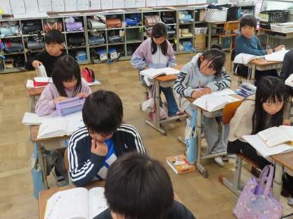 「すがたをかえる大豆」組み立てを確認しています。段落わけをしてから「はじめ」「中」「終わり」に分かれる場所とその理由を話し合いました。最後に意味調べも頑張りました。
