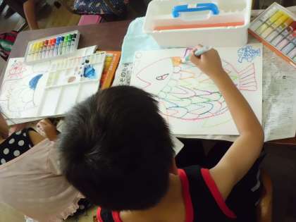 今日は「にじいろの魚」を描きました。クレパスで全体を描き,うろこやひれを絵の具で塗りました。自分で色を作って,初めて筆で塗りました。