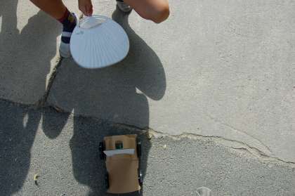 風の力で動く車を作り,風にあてたり,うちわをあおいで走らせました。