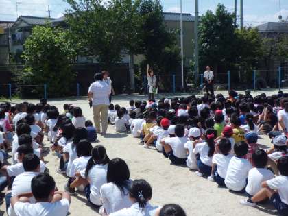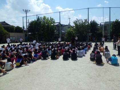 授業中ならクラスごとに避難することができますが,子どもたちがバラバラの中間休みに起きたら…。そういう想定で行いました。どうなるかと思いましたが,事前指導のかいもあり,おしゃべりをせずに素早く運動場に避難することができました。