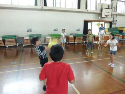 中間休みや昼休みにも、ソフトバレーボールの練習をしています。それぞれのチームに分かれて、主にレシーブの練習をしています。子どもたち同士が、互いにアドバイスをしながら高め合っています。