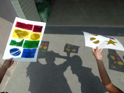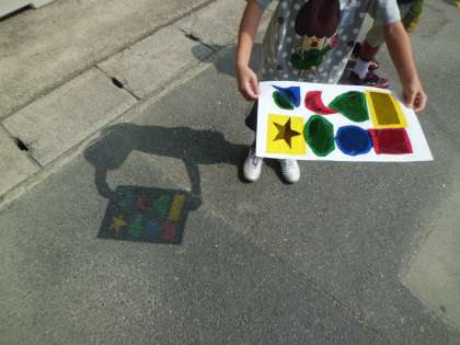 図工の作品ができました。カッターナイフで型を切り取り,カラーセロファンを貼り付けました。「うわ〜!うつった!」「きれい!」と興奮です。