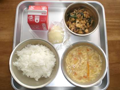 牛乳・ご飯・肉味噌炒め・中華コーンスープ・りんご