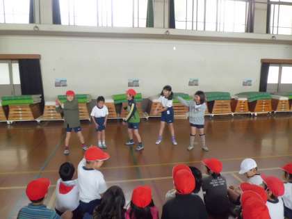 体育ではリズム遊びをしました。音楽「ゆかいな時計」に合わせて身ぶりや手ぶり,踊りを考えます。今日は1時間目で戸惑っている子も多かったですが,だんだん恥ずかしさも忘れて楽しむ子が増えました。