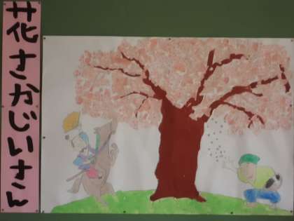 「おじいさんが灰をぱっと木に振りかけると花が咲きました。」のお話をぬり絵や貼り絵で表現しました。みんなで楽しく活動ができました。