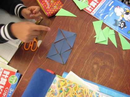 色紙を使って,長方形や正方形,直角三角形をつくりました。