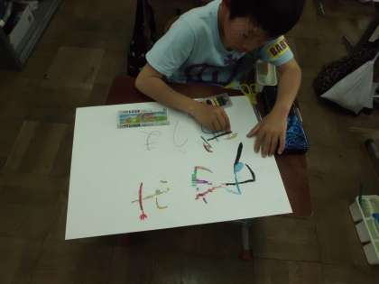 図工では自分の名前をデザインして絵にしています。漢字,ひらがな,カタカナ,ローマ字いろんな字体で楽しんでいます。