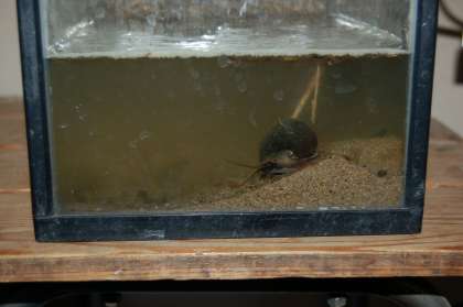 玄関奥の水槽に淀川のお魚や水生生物がやってきました。何種類もの魚とミズスマシなどの水生生物,タニシなどが届きました。数日前から子どもたちは,まだかまだかと待っていました。魚の種類はこれから子どもたちに調べてもらいます。