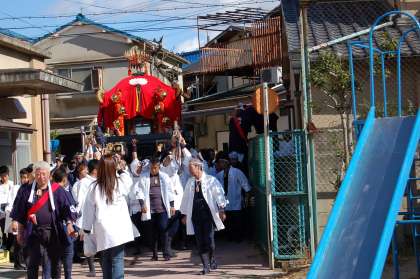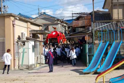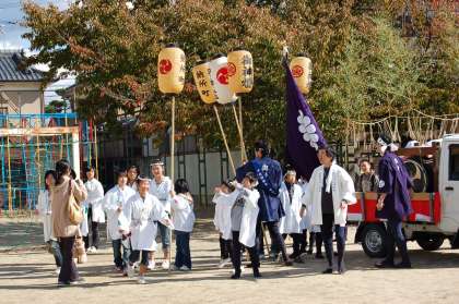 3日(火)は與杼神社祭礼で神輿渡御がありました。その途中,昼食をとるために本校運動場で休憩です。神輿とたくさんの担ぎ手さんがやってきました。細い道路から見事に東門に入ってきました。