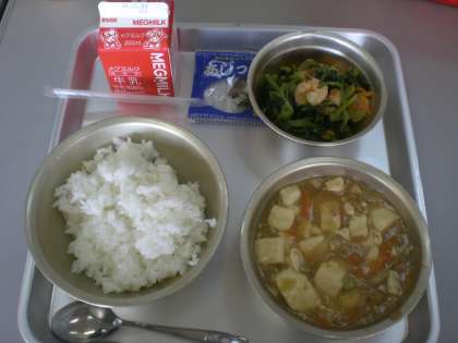 ご飯・五目どうふ・えびと青菜の炒め物・じゃこ(あじっこ)・牛乳