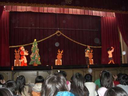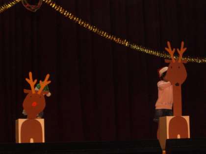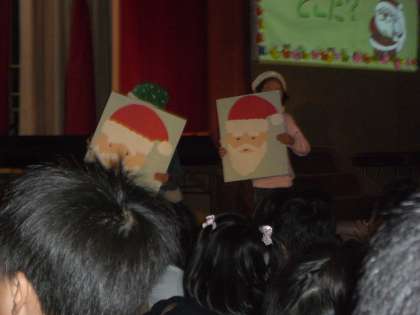 今日は学習発表会にたくさんの方が来て下さいました。3組は3人で力いっぱい楽しんで演じました。泥棒や鬼の登場に会場がわき,ダンスの時には手拍子をもらいました。〜「この人知りませんか?」「待ちくたびれて首がこんなに伸びちゃった」「みんなでクリスマスパーティをしよう!」〜舞台での3人の楽しそうな顔が印象的でした。