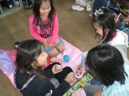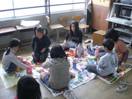 今日は社会見学で小関越えの予定でしたが,前日からの大雨で延期になりました。覚悟していたとはいえ,がっかり…。せめて気分だけでもと,教室にシートをしいてみんなでお弁当を食べました。みんなで楽しくワイワイ…。やっぱりお弁当もいいね。次の社会見学もいれて,結果的に二度楽しめることになったのでした。やったあ!!