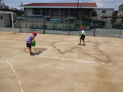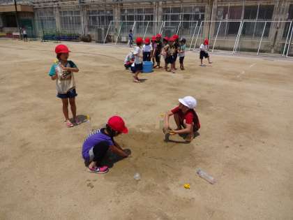 運動場に水で絵を書いたり,大きな川や山を作ったり,泥んこになりながら体全身で楽しみました。