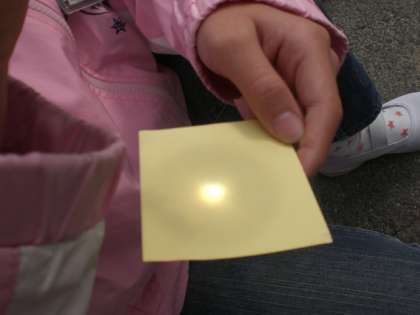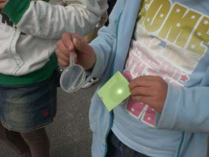 虫めがねを通った太陽の光を紙にあてると,光があつめられて明るい場所ができます。大きな丸い場所にあたっていた光が小さい場所にあつめられると,明るく,温度もたかくなります。