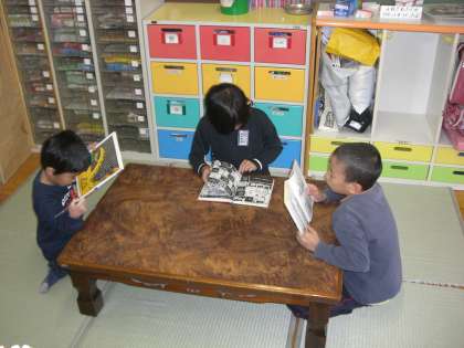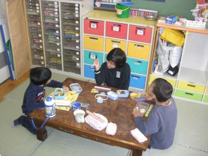 お家の方に作っていただいたおいしいお弁当を、今日は目先を変えて畳コーナーで食べました。おいしくて、3人ともパクパク食べ、食後は静かに読書を楽しみました。雨でもお弁当が食べられて、嬉しい3人でした。