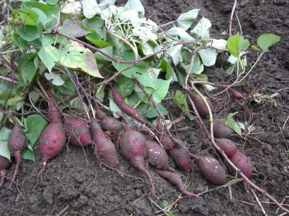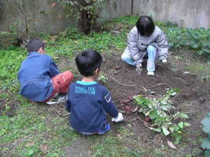 学校園の一隅に半畳ほどの芋畑。大きなおいもができているかな…。ワクワクしながら掘りました。