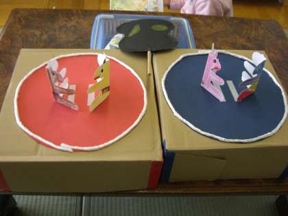 来週26日(木)に3校育成学級交流会(納所・横大路小学校と洛水中学校)をします。その時のお楽しみとして,何をしよう…3人で考えました。いくつか出た案の中から『トントンずもう』に決定し,昨日でき上がりました。今日は試しで盛り上がりました。当日が楽しみです。