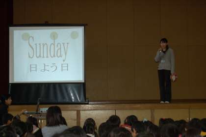 今日の集会の後で,「エンジョイ・イングリッシュ」が行われました。1週間の曜日の歌を全校で歌いました。