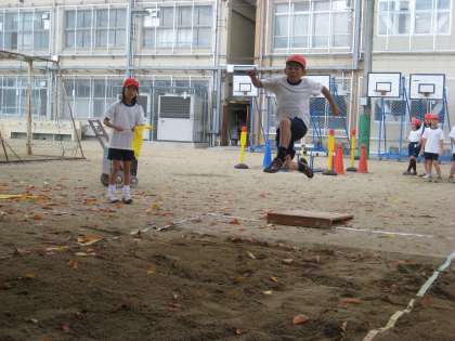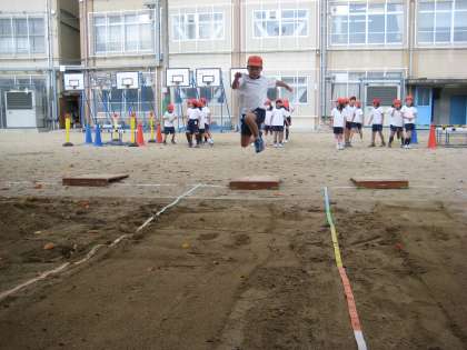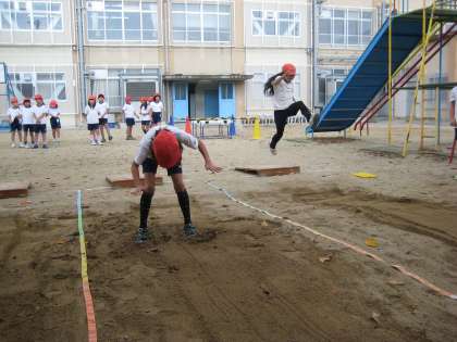 「助走」「踏み切り」「着地」を工夫して,力いっぱい遠くへ跳ぼうと頑張って記録に挑戦しています。