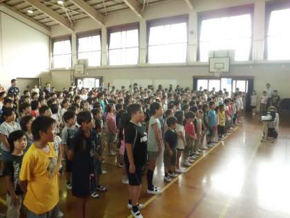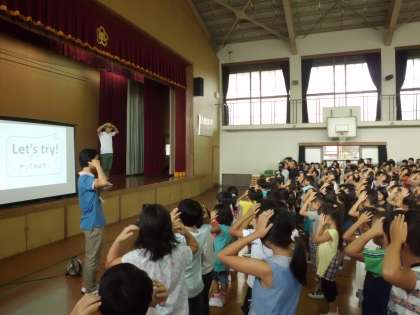 今月の歌「あなたにありがとう」の合唱,美化委員による発表,レッツエンジョイイングリッシュを行いました。美化委員の発表では,掃除用具の使い方について○×クイズをしながら分かりやすく説明してくれました。レッツエンジョイイングリッシュでは,体の各部分について,英語の歌を通して体を動かしながら楽しみました。