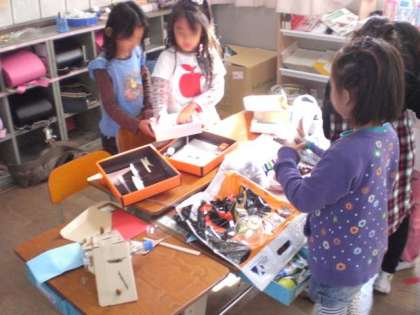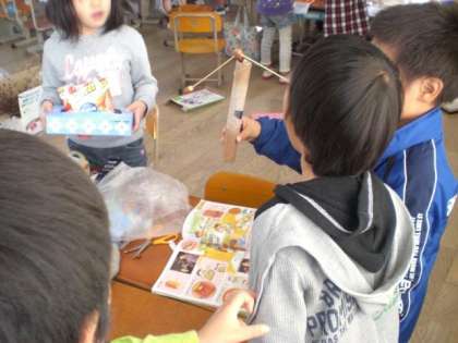 先日の社会見学で集めた松ぼっくりやどんぐり,落ち葉などを使って玩具作りをしました。