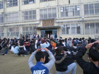 今朝は体育館耐震工事のため,運動場で保健・安全委員会よりの集会が行われました。寒さに負けない体作りとインフルエンザ関係のクイズなどを出しました。