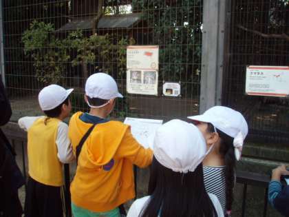 1日(金)に,社会見学で京都市動物園へ行きました。最初は,グループで問題を解きながら,オリエンテーリングを楽しみました。楽しみにしていたお弁当をおいしくいただいた後は,みんなで園内をめぐり,最後にふれあい活動を行いました。スタッフの方からテンジクネズミとウサギのからだのことや食べ物,ふれあい方などを教えてもらいました。そして,テンジクネズミを抱っこしたり,ウサギをさわったりしました。