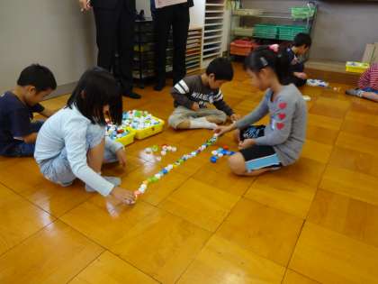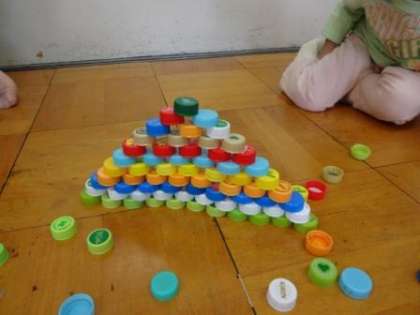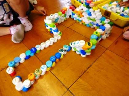 図工の「なにになるかな」の学習で造形遊びをしました。1回目はペットボトルのキャップをつかいました。積んだり,並べたり,いろに分けてみたり・・・
