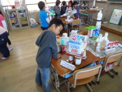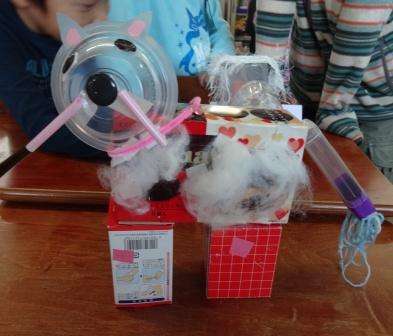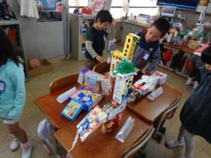 図工で取り組んだ「はこのなかまたち」ができあがりました。箱を組み合わせていくと不思議な生き物たちができあがりました。なかなか思い通りに接着できなくて,悩んだりもしたけれど,出来上がった作品にみんな大満足!お友だちの作品を見ながら,いいところを見つけるのも力が入りました。