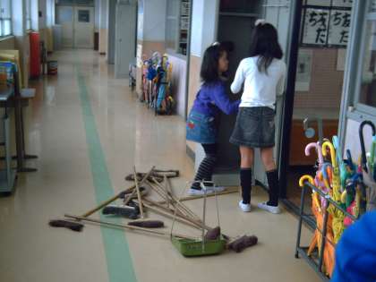 みんなが乱雑に入れたほうきを全部だし,右の写真のようにきれいに入れ直してくれていました。