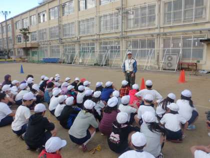 朝方からあいにくの空模様でしたが、お昼近くには雨も上がり、なんとか体育の授業を行うことができました。今日は1組・2組合同での体育です。
