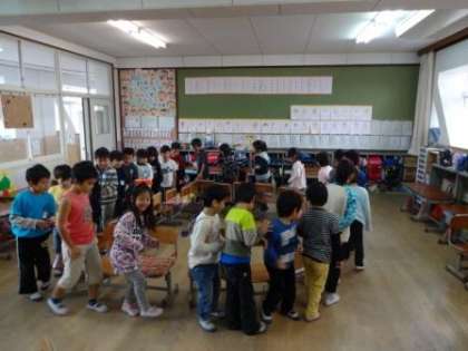 中間休みも雨のため,外には行けず。。。すかさずゲームがかりが「いす取りゲームをします!」といす取りゲームがはじまりました。大好きな音楽に合わせてくるくるまわっていました。雨の日も仲良く遊べる1年生でした。