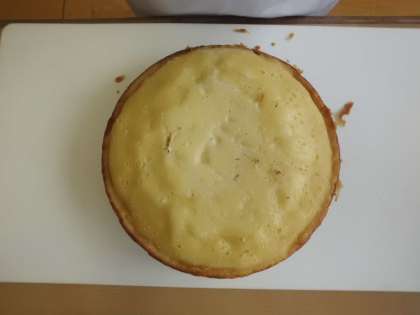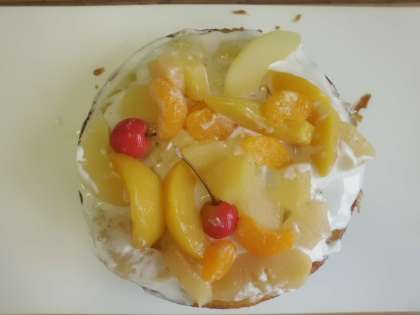 粉の中にパイナップルを刻んで入れ,できあがったケーキ(弾力があります。)にホイップクリームとフルーツでデコレーションしました。