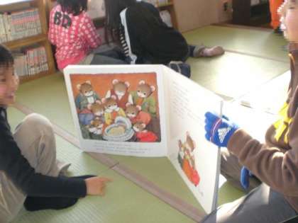 あしたから,28日(木)まで たくさんの本を 5ねんせい・6ねんせいの おにいちゃん・おねえちゃんが よんでくれます。 休みじかんは,ぜひ としょしつに いこうね!