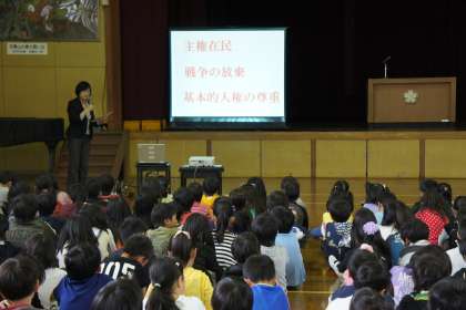 今日の朝会では,5月3日の憲法記念日にちなんで基本的人権の尊重について学校長から話がありました。