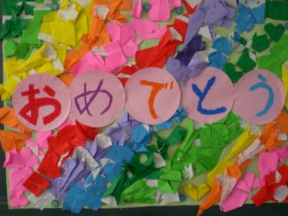 1年生は折り紙を折って,「おめでとう」のまわりを飾ります。貼るのが大変ですが,がんばっています。
