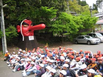 「うわぁ!すごい。」叡山電鉄鞍馬駅を降りると大きな天狗の顔が…。