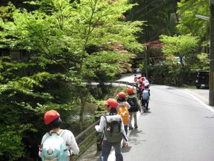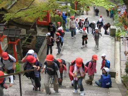 そこをスタートに子どもたちは3年生となかよしグループを組んで鞍馬山を登り始めました。最初は心優しく3年生を気遣いながら登っていました。しかし,そのうちだんだん離れ離れになる班もでてきました。鞍馬寺金堂でグループごとにお弁当をいただきました。今日は良いお天気の中,みんな元気に戻って来れて良かったです。