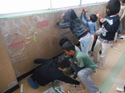 たまごパックや,空きようきなど身近な材料を使って,廊下を大変身させました。思いついたことに合うように,材料の組み合わせ方を考えて作りました。どの班の作品も工夫していてすてきでしたね!