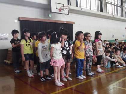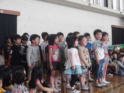 人権集会では,それぞれのクラスの学級目標について発表しました。初めて大人数の前で発表したので,とても緊張していましたが大きな声で元気よく発表できていました。