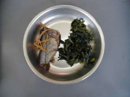 さんまのかわり煮 ほうれん草のおかか煮 若竹汁 ごはん 牛乳