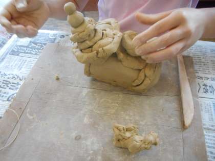 粘土ベラや切り糸などを使い,工夫して作品を作りました。
