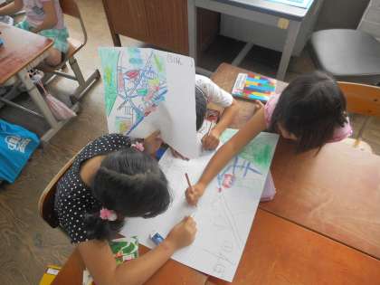 校区探検をして気づいたことをもとに,絵地図を作成しています。