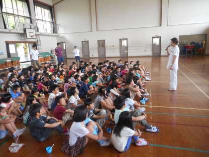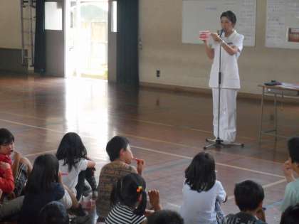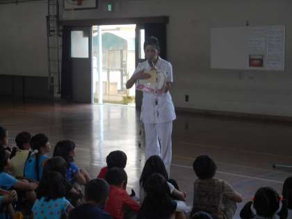 実際にはぶらしを使って,歯と歯ぐきの間を磨き,歯を健康に保つための方法を学びました。子どもたちは,ブラッシング後「歯がきれいになって気持ち良い!!」と言っていました。