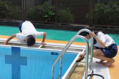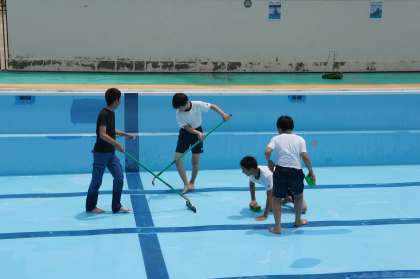金曜日はプール清掃がありました。朝は雨が降っていましたが,中間休みをこえたあたりからキラキラと太陽が見え始め・・・3・4時間目から絶好のプール清掃日となりました。
