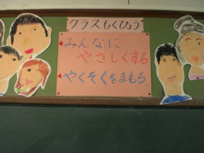 これは1年2組の学級目標です。お友だちにいやな言葉を言ったり,けんかをしたりしないで,みんな仲良く楽しいクラスになるように,みんなの願いをこめて目標にしました。