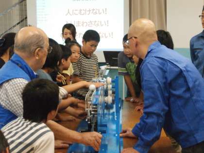 村田製作所の方からは,ゴルフボールを最後まで運ぶ機械を工具を使って調節しながら一緒に作り,ボール運び競争などをして楽しみました。ボールを最後まで運ぶには機械のねじの微妙な調節が必要で その調節をしっかりできてこそ楽しめることを学びました。